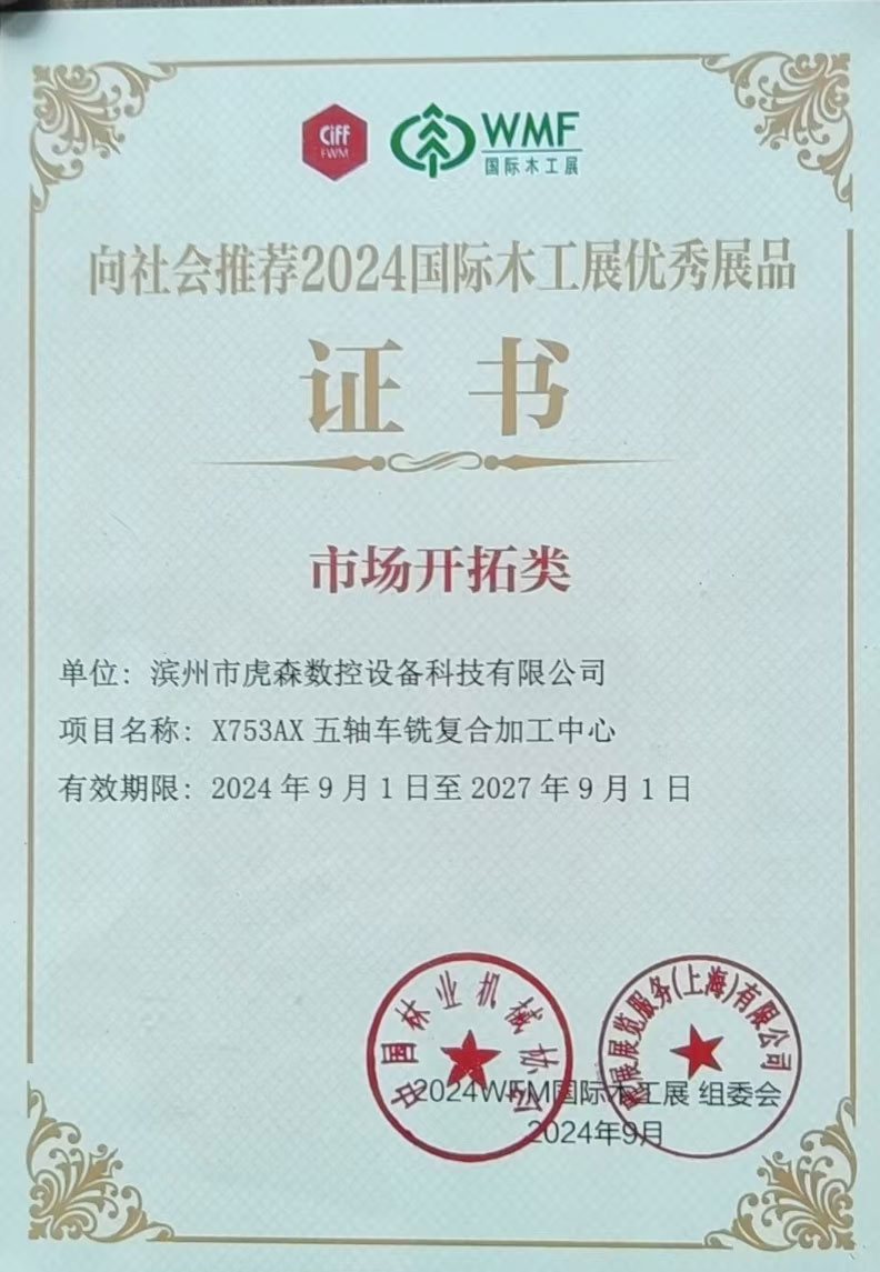 經(jīng)過(guò)組委會(huì)及專家評(píng)審組按照客觀、公正、科學(xué)的原則,通過(guò)會(huì)議評(píng)審和現(xiàn)場(chǎng)走訪詢查相結(jié)合的方式對(duì)申報(bào)展品進(jìn)行嚴(yán)格評(píng)審,濱州虎森數(shù)控設(shè)備科技有限公司的“X753AX五軸車銑復(fù)合加工中心”最終榮獲2024“國(guó)際木工展”優(yōu)秀展品推薦。這一榮譽(yù)的獲得,不僅是對(duì)我司產(chǎn)品的高度認(rèn)可,也是對(duì)公司多年來(lái)在實(shí)木家具數(shù)控設(shè)備制造領(lǐng)域不斷創(chuàng)新和努力的肯定。