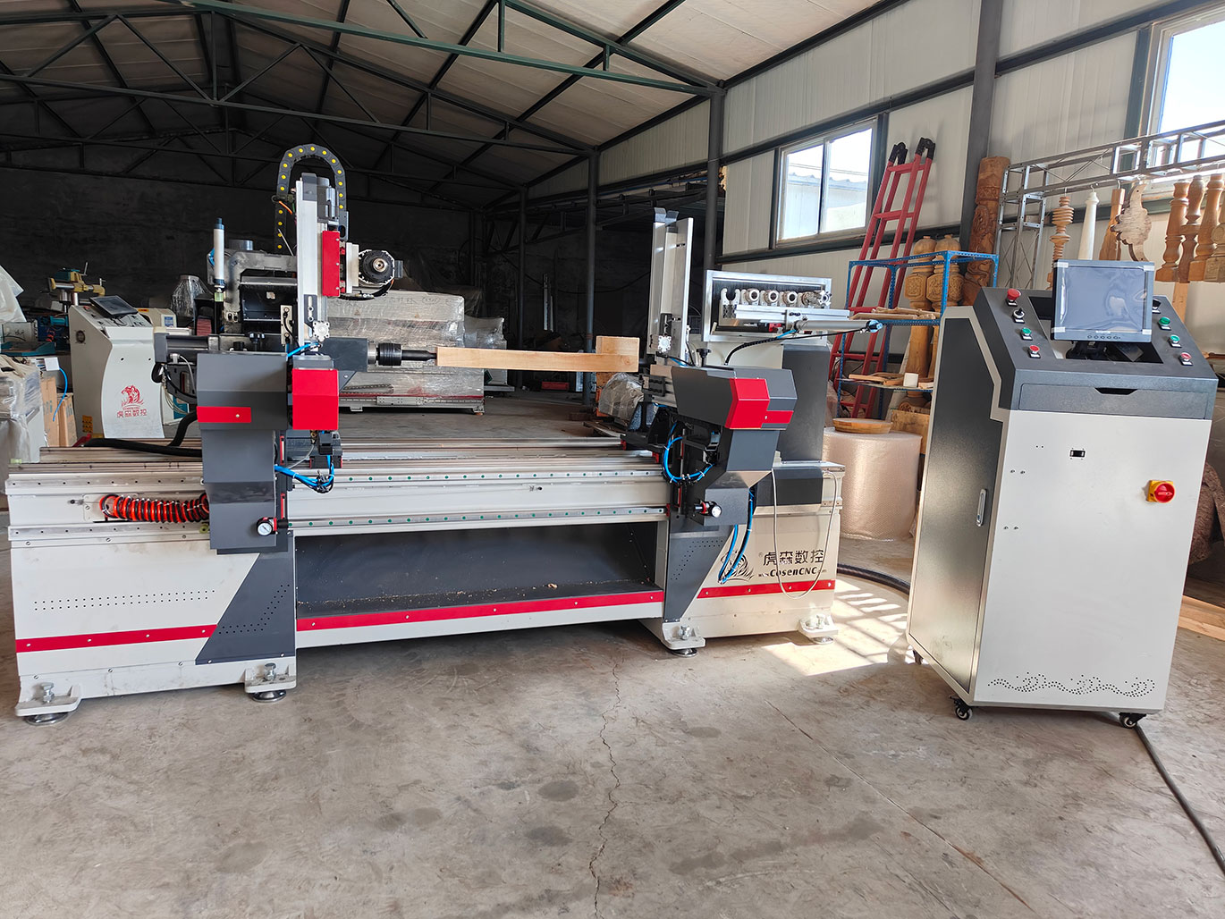 4軸數(shù)控車(chē)床L623AT共8工序, 自動(dòng)上下料.自動(dòng)砂光, 多功能一體機(jī)??梢攒?chē),銑,鉆孔,拉槽,鏤空,拉線(xiàn),雕刻;
